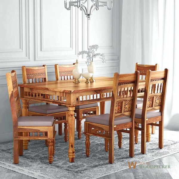 The perfect balance of strength and style. A solid wood dining set with thick legs for everyday use. Available in all wood types including Nilambur Teak, Rosewood, Mahogany, Jackfruit & more. Custom design also available.