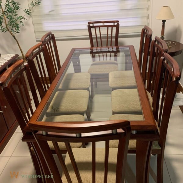 Sleek, shiny, and sophisticated. A modern wooden dining set with a high-gloss premium finish. Available in all wood types including Nilambur Teak, Rosewood, Mahogany, Jackfruit & more. Custom design also available.