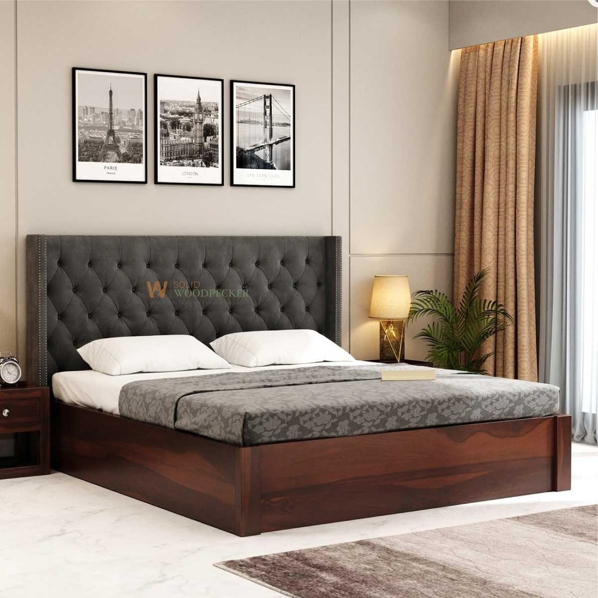 Indulge in the ultimate luxury with the Premium Wingback Cot. This design features a majestic, tall wingback headboard with deep button tufting in premium fabric, offering hotel-like comfort right at home. While the headboard provides softness, the base is pure SolidWoodPecker strength—crafted from Nilambur Teak, Rosewood, or Mahogany. The visible wooden frame at the base adds a warm, natural contrast to the cool tones of the upholstery. This cot is perfect for those who enjoy reading or watching TV in bed, providing excellent back support. It is a sophisticated blend of soft textures and hard-wearing Kerala timber.