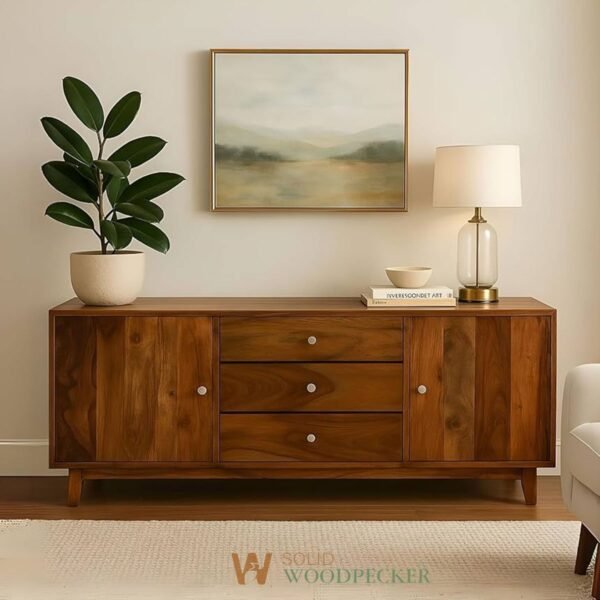 A robust and versatile wooden cabinet for living room storage. Available in all wood types including Nilambur Teak, Rosewood, Mahogany, Jackfruit & more. Custom design also available.