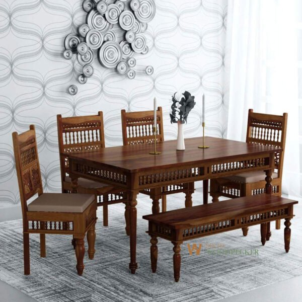 Casual and communal. A charming dining set featuring a bench on one side for a relaxed atmosphere. Available in all wood types including Nilambur Teak, Rosewood, Mahogany, Jackfruit & more. Custom design also available.